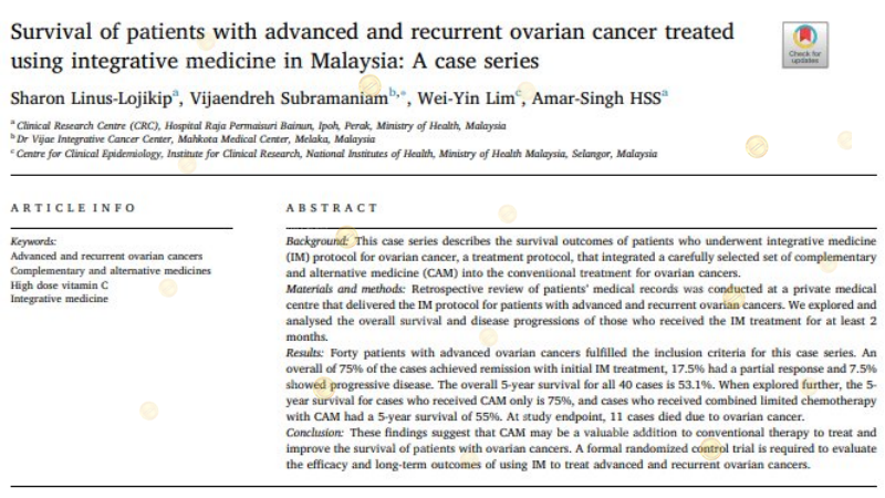 The effectiveness of this approach is supported by clinical data. Dr. Vijaendreh Subramaniamh presented results from a prospective study conducted in 2023, which included 40 patients with advanced or recurrent ovarian cancer. The data showed that the five-year survival rate was 75% in the group receiving only complementary and alternative medicine (CAM), 55% in the CAM combined with limited chemotherapy group, and 0% in the chemotherapy-only group. This demonstrates that structured, integrated approaches can provide better survival benefits and quality of life for patients with poor prognoses.