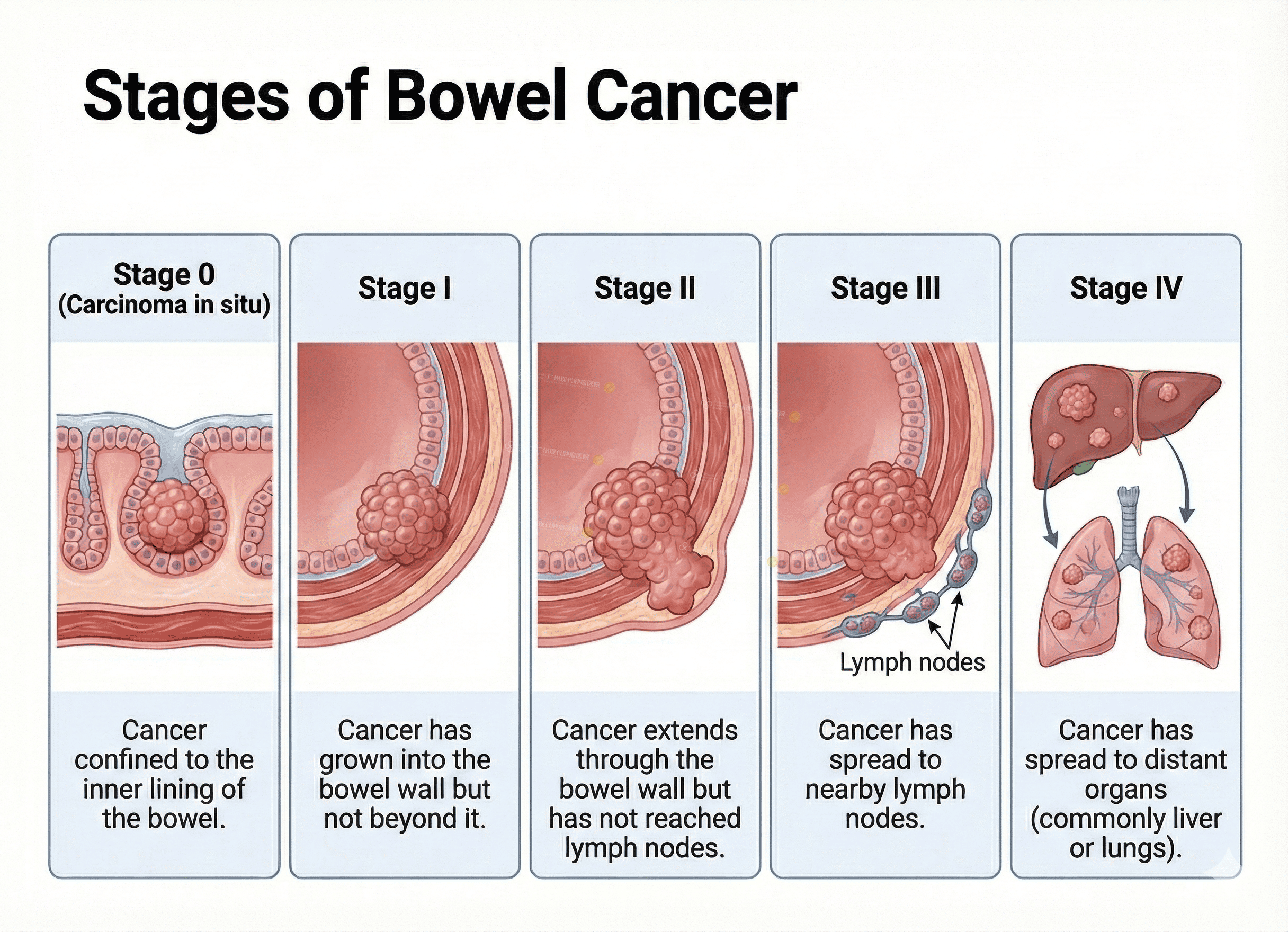 Cancer has grown into the bowel wall but not beyond it.Stage II