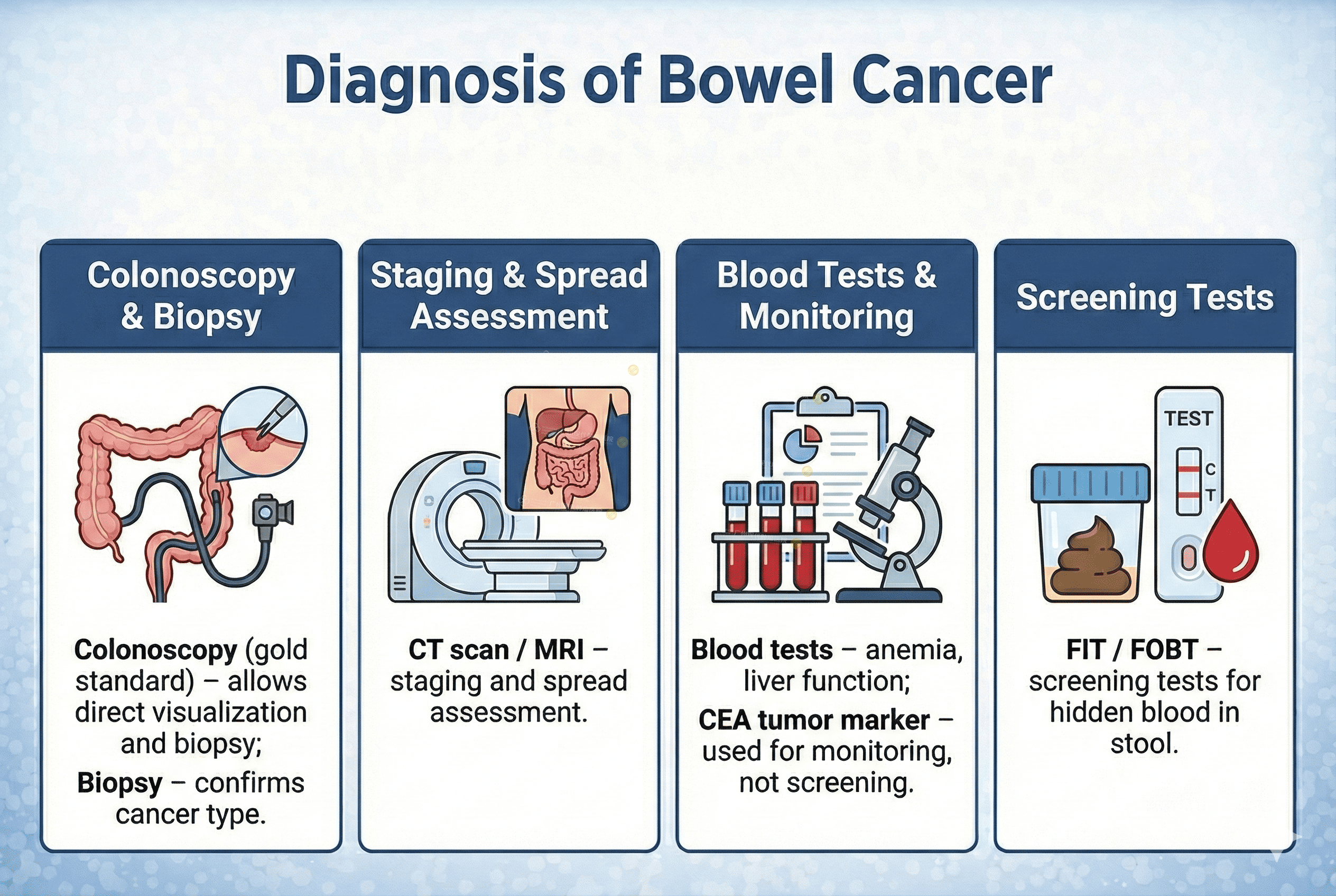 Bowel cancer arises when normal cells in the lining of the colon or rectum undergo genetic mutations, leading to uncontrolled growth. These abnormal cells can invade nearby tissues and may spread (metastasize) to lymph nodes, liver, lungs, or other organs.