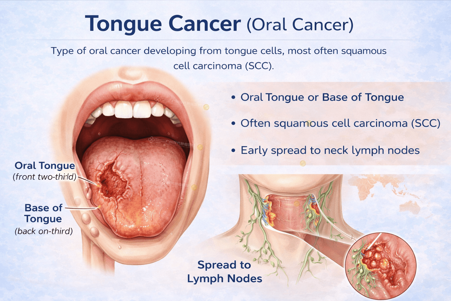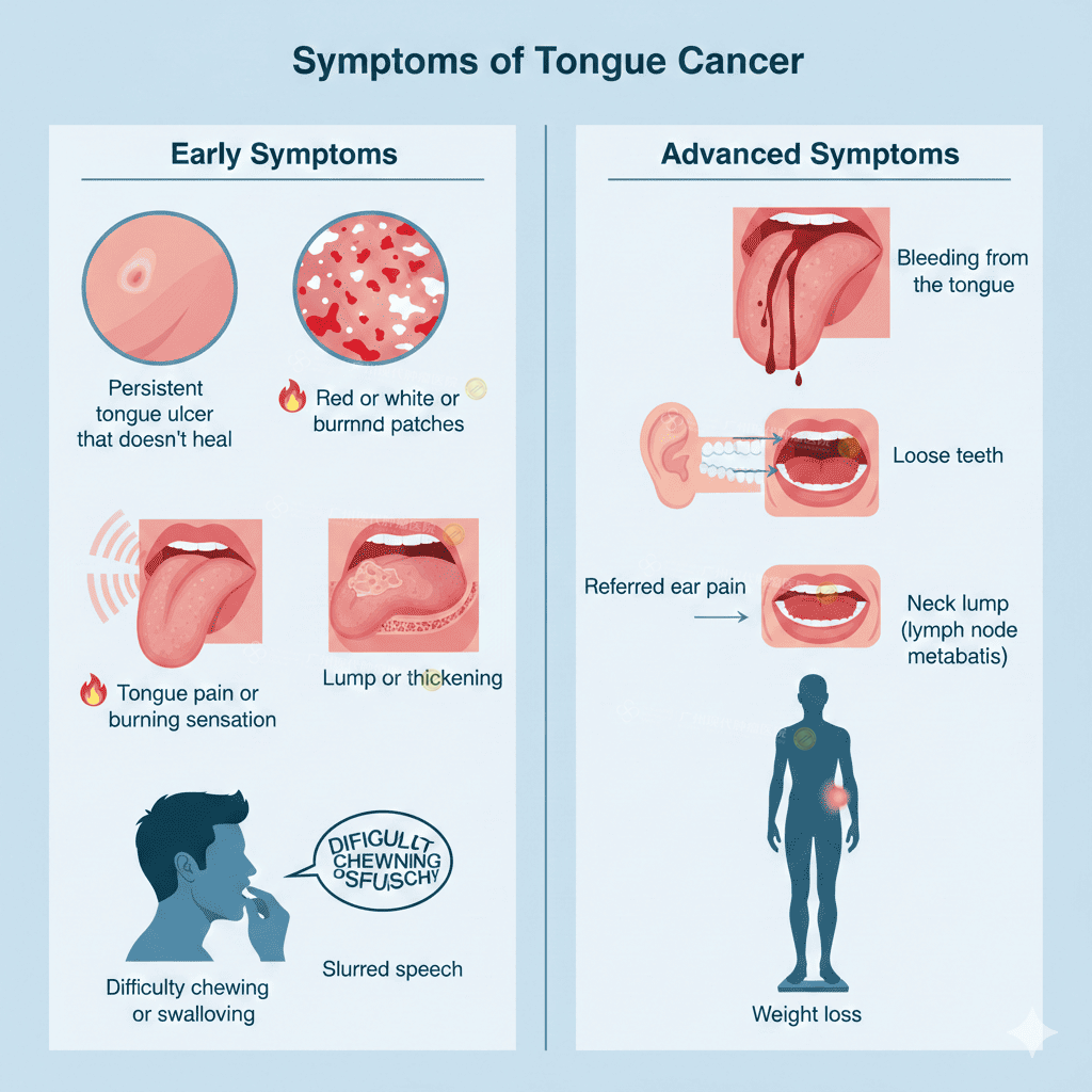 Tongue cancer is a type of oral cancer that develops from the cells of the tongue, most commonly squamous cell carcinoma (SCC). It can arise on the front two-thirds of the tongue (oral tongue) or the base of the tongue (oropharyngeal tongue).