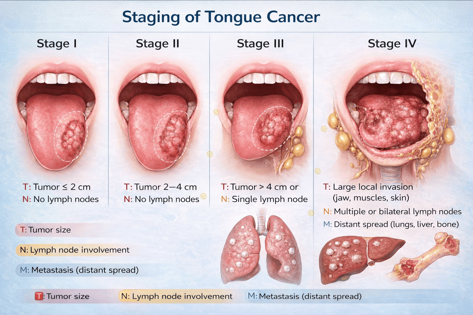 Tongue cancer staging depends on tumor size (T), lymph node involvement (N), and metastasis (M).