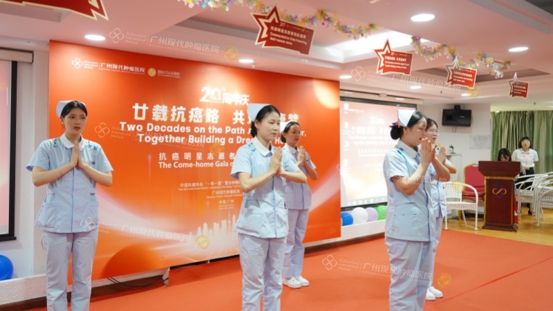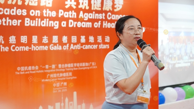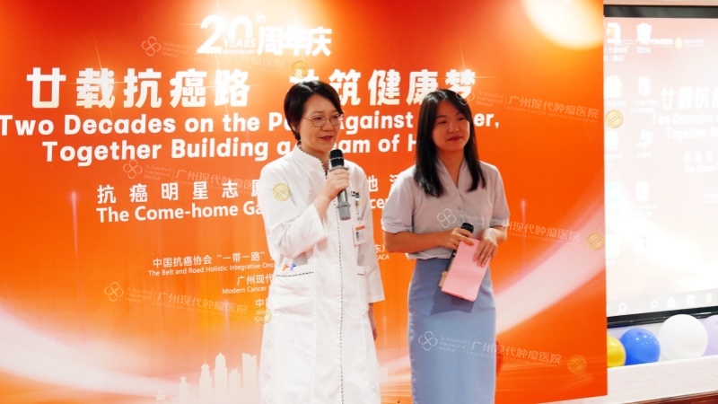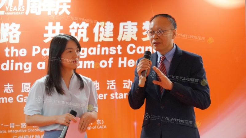 王怀忠院长首先代表广州现代肿瘤医院林新伟总经理向在场嘉宾致以诚挚问候。他在致辞中动情地说:“二十年,我们累计救治了来自全球的十万余名国际患者;见证了无数生命的奇迹。今天回家的每一位抗癌明星,不仅是医院二十年奋斗史上最闪亮的勋章,更是‘医患同心、抗击癌魔’最生动的见证!值此二十周年庆典之际,我谨代表医院送上最美好的祝愿:愿广州现代肿瘤医院在新征程上再创辉煌,继续为人类健康事业贡献力量;愿所有正在治疗的患者坚定信念,早日重获健康!”