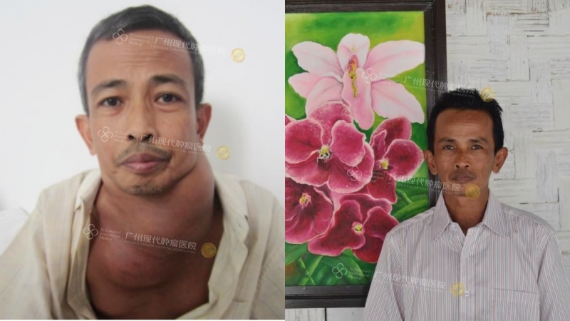 2013年6月,苏吉安多第一次来广州现代肿瘤医院时,他的脖子比头还要大,且难以转动。左侧颈部及前颈部的肿块大小约25*15cm,被确诊为霍奇金淋巴瘤IV期。以介入疗法为主的综合治疗方案治疗后,颈部肿瘤消失,现已成功抗癌12年。