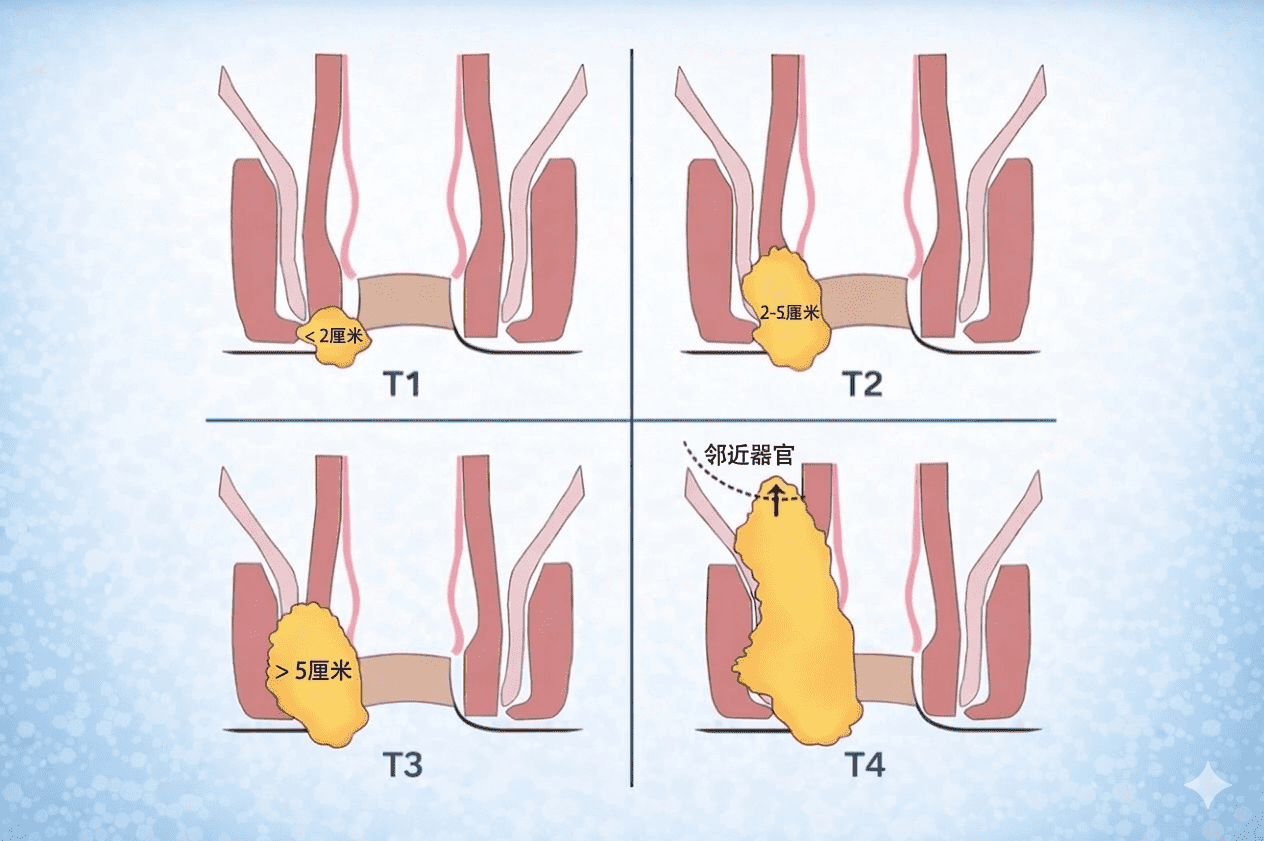 肛门癌采用TNM 分期系统进行分期,主要依据肿瘤大小及其扩散情况: