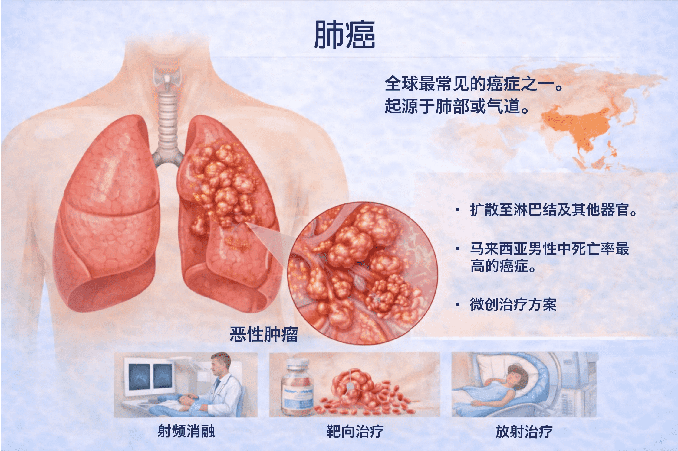 肺癌是全球最常见的癌症之一。肺癌起源于肺部或呼吸道(包括气管和支气管),并可能扩散至淋巴结或身体其他器官。