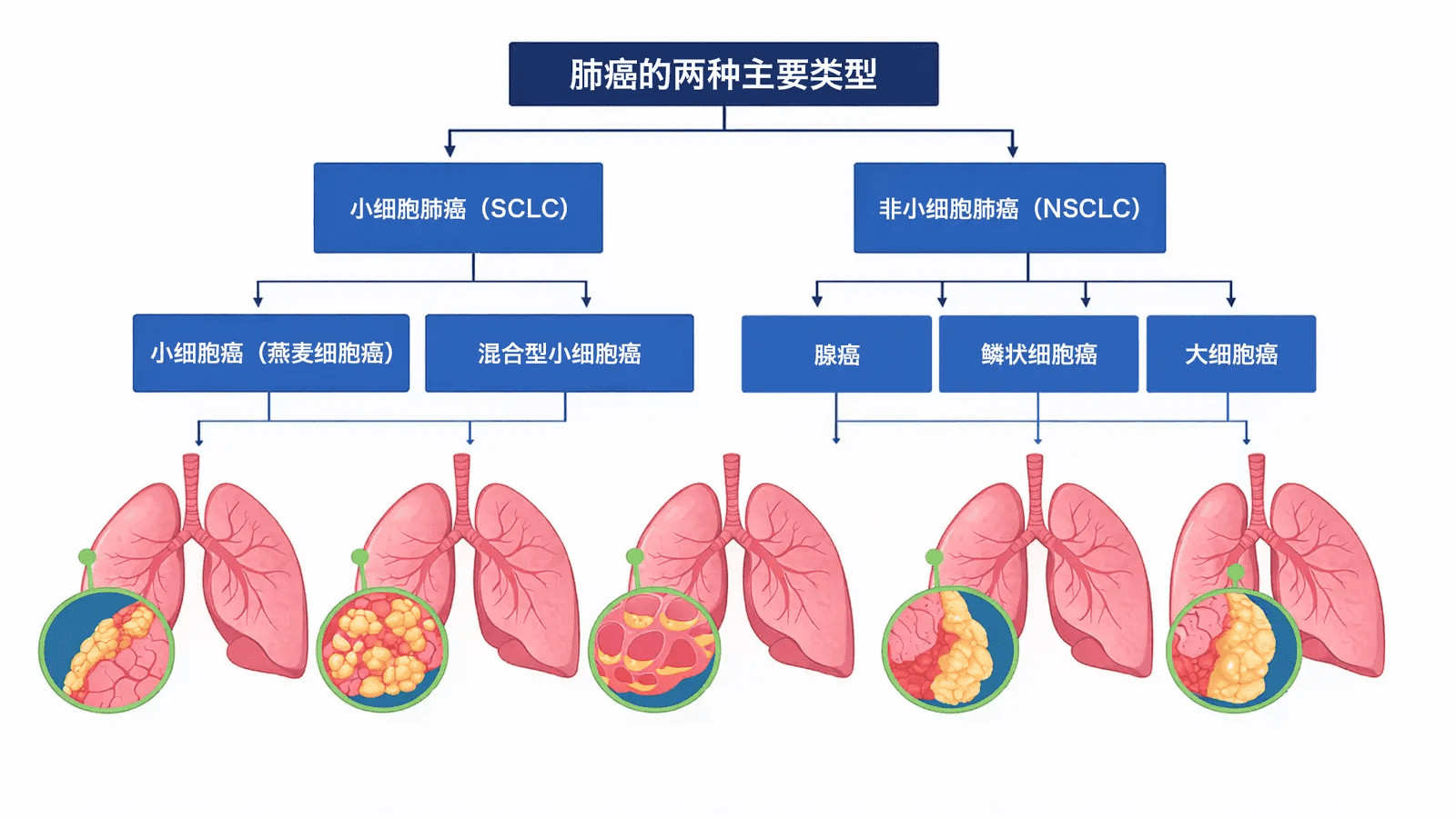 这是最常见的肺癌亚型,起源于腺体上皮细胞。肿瘤通常位于肺部周边区域,在不吸烟者中更为常见。
