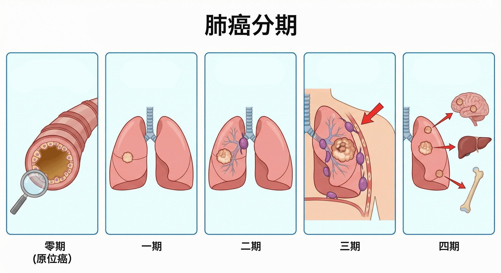 肺癌分期用于描述疾病的扩散范围,并有助于指导治疗决策。分期是依据TNM 系统进行评估的,包括肿瘤大小(Tumor)、淋巴结受累情况(Node)以及是否发生远处转移(Metastasis)。