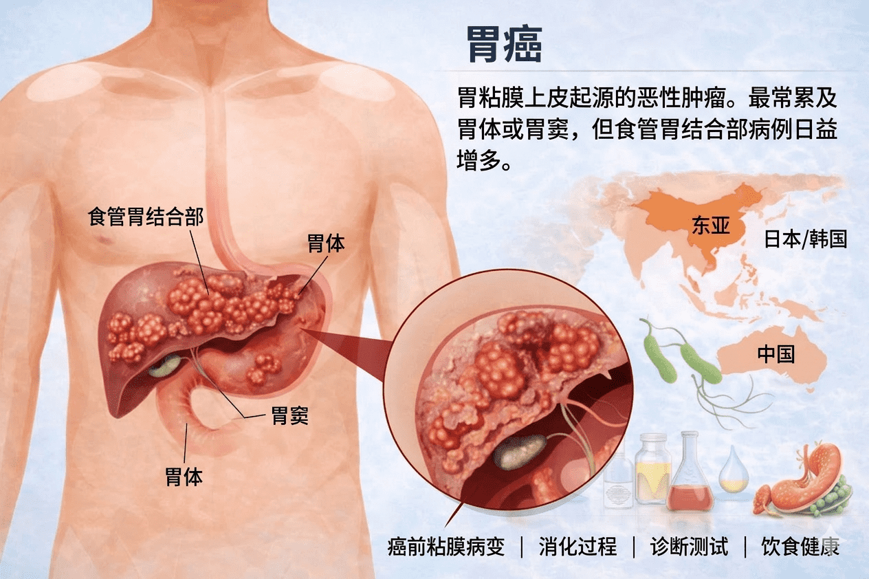 胃是位于上腹部的中空肌性器官,在消化过程中起着关键作用。癌症可发生于胃的任何部位,但最常见于胃体和胃窦。近年来,发生在胃食管结合部附近的胃癌病例逐渐增多。尽管全球范围内胃癌的发病率有所下降,但它仍然是癌症相关死亡的重要原因之一,尤其在东亚地区较为常见,包括日本、韩国和中国。