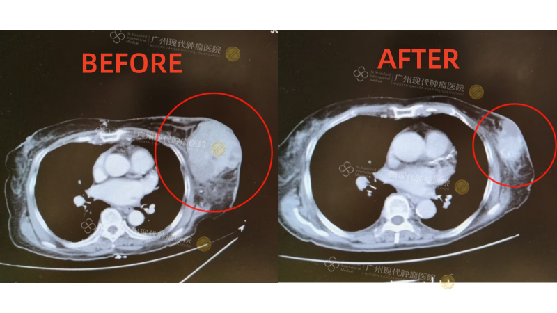 By July 2024, her family sought treatment in Singapore, where she was diagnosed with invasive ductal carcinoma (Grade III, HER2-positive, ER/PR-negative) with lymph node metastases in her armpits and collarbones. Despite three months of chemotherapy in Singapore, her tumor expanded to 4.4×5.5cm (SUVmax 18.4), with thickened, reddened breast skin and escalating pain. Uncontrolled hypertension exacerbated by chemotherapy side effects further deteriorated her health, leaving her family desperate.