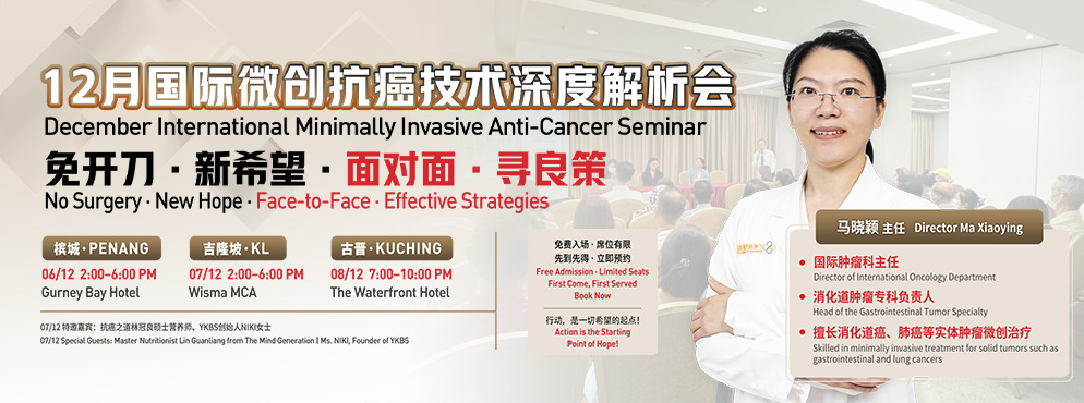 From December 6th to 8th, Director Ma Xiaoying, the Head of the International Oncology Department and the Specialist in Charge of Gastrointestinal Tumor Specialty at Modern Cancer Hospital Guangzhou, will personally visit Penang, Kuala Lumpur, and Kuching in Malaysia to conduct exclusive seminars on “Minimally Invasive Technologies for Cancer Prevention and Treatment”, unveiling the scientific secrets behind “treating cancer without surgery”!
